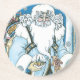 Julillustration i victoriansk stil med glädjerik juldesign med en jolly jultomte i skogen. Sankt Nikolaus är klädd i en blå rock och håller en snöglob i ena handen och en käpp i den andra. En söt teddybjörn hänger från hans rock och en påse med leksaker är över hans rygg, redo att levereras på julafton. En snövit vinterscen i skogen med träd, snöflingor faller från natthimlen. God jul och gott nytt år!
