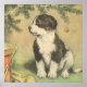 Vintage illustration av God jul-helgdag:s utformning med en adabel kolliesvalp från gräns under sitta under Julgran. Den här söta päls baby står bredvid några musikinstrument, en buggel eller trumpet och några trummor väntar bara på familjen på julförmiddagen! Den här cutien kommer att göra några barn mycket lycklig!