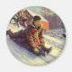 Vintage illustration av God jul helgdag-bilden med en pappa där hans lilla flicka på vintern har roligt som sjunger på en sled eller toboggan ner en backe som täckts av snö.