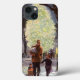 Vintagen illustrerar bilden av God jul helgdag med ett far som tar sina barn ut och shoppar efter gåvor och presenter på julen Kväll. En stor vit dekorerad Julgran ligger på stadens torget. En son dras i en sled genom snö på stadens sidopromenad.