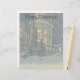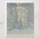 Vintage illustration God jul helgdag design med ett arkitektoniskt snöslam på vintern. Framsidan av ett hus i snö täckte med julhus i fönstren.