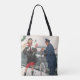 Vackra tote-väskor med tryck över hela ytan! Finns i två stilar och två storlekar! Vintage-illustration Glad jul-helgbild med en mamma som bär julklappar tillbaka till sin parkerade bil. En snäll polisman lagför man foder hennes parkometer medan det snöar under vintersäsongen. Rolig 50-tals retro kitsch-design!