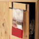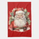 En kökshandduk med en söt vattenfärgsbild av vintage stil. Jultomten i sitt röda kostym med jollekinkor och ett leende ansikte. Omgiven av gräs och holly.