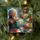 Personlig julprydnad. En söt liten pojke som öppnade en gåva på jul kväll med ett stort leende. Ett söt Julgran med antika ornament i guld och rött. Anpassa meddelandet på kortets baksida.