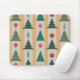 Denna musmatta har en modernt utformning av Julgranar och prydnadsföremål som är upphängda på ett trädgårdsområde med guld och silver.