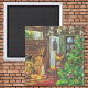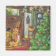 Vintage julillustration med en dekorerad julgran och en brasa i den öppna spisen i vardagsrummet i ett mysigt hus av stockar. Vardagsrummet i ett mysigt hus eller stuga i skogen på vintern. Stickor och garn hänger över en stol.