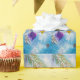 Vacker återinslagning papper med guld, blå och lila glanka Julgran på vattenfärgsbakgrund.
