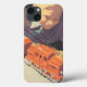 Vintage illustration Art Deco God jul helgdag-design som visar ett lycklig ungt barn som leker med sitt nya leksak tåg på julförmiddagen. Säsongens hälsningar!