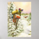 Bilden av vintagen Victorian Era God jul helgdag med ett snöskum med brevlådor fyllda med snö fyllda med julpost och presenter på vintern. En hästdragen vagn kör ner snögatan med träd och en skog på sidan. Glad helg och Season hälsningar!
