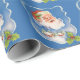Vintage julillustration med ett flytande tomteansikte över en snötäckt by. Band med stjärnor och julmistel inramar scenen.