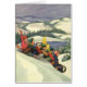 Vintage julillustration med barn som åker pulka nerför en snötäckt kulle på juldagen.