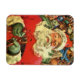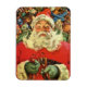 Vintage-illustration Glad jul semesterbild med en jovial tomte som flyger sitt släde med en säck full av spel, leksaker och dockor. Du kan se tomtens långa vita skägg fladdra i vinden!
