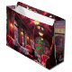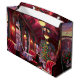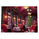 Vintage God Jul Sömnrestaurang med elegantens burgiga stolar, varmt ljus, belyst kopp, röd matta och glatta gräs Julgran.