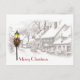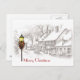 En svart och vit skiss av en viktoriansk by där det enda färg är gatulampan och Juldekorationer. Omtryckt på vykortet.