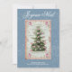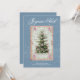 En vintage julgransetikett konstnärlig illustration överlagd på en akvarell vinter snöscen bakgrund i djupt mjukt blått och vitt. Snöscen på baksidan också. Ett säsongskort med en mjuk lugn naturscen för en mysig hemtrevlig stämning.