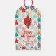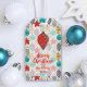 Glad jul personliga gåva eller förmånsetiketter med vintage julgransprydnader i rött, guld, lila, turkos och mint och din hälsning och namn i chic skrivstil. MATCHANDE inbjudningar, tallrikar, servetter, presentpåsar och mer i vår butik.