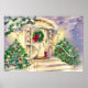 En vacker vintage Christmasy dekorerade land hus i ett vinterlandskap. Två Julgranar står bredvid ingången till huset, i varje fönster tänd ett ljus och på dörren hänger en julkrans. Anpassa till personlig av presentprodukten!