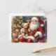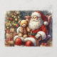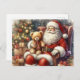 Julvykort vintage-stil med en glad Jultomten, presentpaket, nalle och lätt snöfall.
