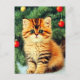 Vykort med en årgång julkatt! En orange kattunge med svart rand ligger i snö. Bakom katten finns en Julgran med röda och gult prydnadsämnen. Även på snö är en röd present. En perfekt till julsäsongen och kattälskare!