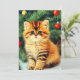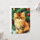 Kort med en årgång julkatt! En orange kattunge med svart rand ligger i snö. Bakom katten finns en Julgran med röda och gult prydnadsämnen. Även på snö är en röd present. En perfekt till julsäsongen och kattälskare!