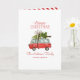 Med den här roligtens vattenfärgsbil och julgran. En vacker handmålad röd bil och grönt träd, ge, en traditionell rustik känsla, som kompletteras av ett modernt, trendig, djärvt typsnitt. Texten kan vara personlig med din familj namn och ett budskap om att göra extra speciellt.