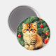 Magnet med en årgång julkatt! En orange kattunge med svart rand ligger i snö. Bakom katten finns en Julgran med röda och gult prydnadsämnen. Även på snö är en röd present. En perfekt till julsäsongen och kattälskare!