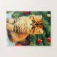 Pussel med en årgång julkatt! En orange kattunge med svart rand ligger i snö. Bakom katten finns en Julgran med röda och gult prydnadsämnen. Även på snö är en röd present. En perfekt till julsäsongen och kattälskare!