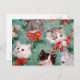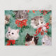 Fint vintage bild av svart, grått och vit katt ansikte som leker eller bär en röd bandbåge. Den här designen är grönt för kattälskare, som blandats i bakgrunden med vissa mistletoe löv.
