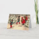 Det här julkortet har en vintage med barn på skidor i det gröna träd