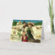 Det här är ett fantastiskt vintagekort av en elegant klädd ung familj på väg till kyrkan. Far är i en svart jacka med brunt päls och har en smart hög hatt. Mor är klädd i en grönt jackat och stor hatt med fjädrar. Båda bär hollier. Den söta lilla blondflickan är klädd i rött och håller en bok i ena handen och bär en Julgran i den andra. I snö bakom dem finns renar, och kyrkan kan ses i avstånd. Kortet lyder: "En god jul". Detta är verkligen ett vackert familjejulkort.