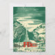 Vintage illustrerar helgdag utformning med en religiösa i ett sött bergsområde. Ett vinterlandskap med berg, träd och snö. Originalet är en bra med röd färg och grönt.