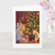 En vintage-julbild visar en familjematod i ett underbart hem som glorifierar med ljus på Julgran. En mor och tre flickor i nattvargen tittar genom gåvorna under träd för att se vilka som tillhör dem innan de börjar öppna dem. Meddelandet i kortet är: "Må dina helgdagar gnistra och skina."