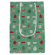 Vintage julprydnadsämnen i rött, grönt och kräm på en texturerad mint grönt-bakgrundspresentsäck - perfekt för en årshelg.