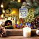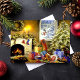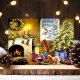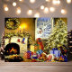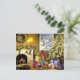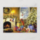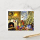 Vacker vintage jul levande rum scen vykort. Denna design har en vacker öppen spis dekorerad med belyst krans, julstrumpor och ljus. Det finns en snöman som tittar genom fönstret och en hög med presenter som sitter under det dekorerade upplysta julgranen. Vad en vacker högtidsscen.