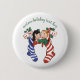 Vintageillustration Glad jul semesterdesign med tvillingbarn som hänger i julstrumpor dekorerade med järnekblad och bär. Flickan är i den blå och vita randiga strumpan och pojken är i den röda och vita randiga strumpan. Roligt, roligt och humoristiskt foto, perfekt för hela familjen!