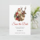 Spara datumkortet med en roligt julillustration. Jultomten i sitt traditionella röda kostym rider en stor, skrynklig renar som dekoreras med holly. En Julgran i baksidan.