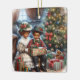 En årgång julmorgon personlig jul-prydnad. Två små barn från färg som öppnar helgdag är klädda i Söndag bäst. Cute vintage vibes om en gammaldags jul.