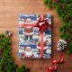 Denna pappra julomslutning har en lekfull, upprepande mönster i Jultomten i olika lägen, mot en ljusblå bakgrund med snöjord och sparse evergreen träd. Tomten framställs i sitt traditionella röda kostym med vit trim, svarta stövlar och ett varmt leende. Vissa håller i Julgranar och polkagrisar. Utformningen frammanar en glad och klassisk helgdag, perfekt för ge gåva.