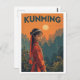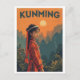 Discover the charm of Kunming, China, with this beautifully illustrated vintage travel poster style postcard. It features a young person in traditional Chinese attire, adorned with intricate patterns and delicate headwear, gazing thoughtfully over a landscape of majestic mountains under a warm, golden sunset. The foreground is dotted with lush foliage and subtle flowers, evoking the "City of Eternal Spring." Perfect for sending a unique greeting, decorating with Asian-inspired art, or collecting retro travel memorabilia. This postcard captures the cultural richness and scenic beauty of Kunming.