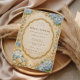 En romantisk kustdesign med mjuka blå hydrangeor, sniglar, nautiskt rep och ömtåliga ankare arrangerade runt en elegant utsirad ram. Vattenfärgblommorna och den varma pergamentbakgrunden skapar en tidlös strandestetik inspirerad av klassiska kustträdgårdar och vintage marina detaljer. Perfekt för en elegant fest med en mjuk havsinspirerad atmosfär.