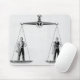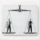 Vintagen illustrerar den svarta och vita affärssymbolutformningen med två manar-balanseringar i stora skikt av rättvisa. Den ena mannen företräder den blå fackliga fackliga fackföreningen på den ena sidan och den andra mannen företräder den verkställande ledningens vita kostym på den andra. Vikten av parterna är balanserad, vilket representerar enhet och rättvisa inom företaget.