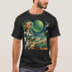 Vintage-futuristic, science fiction illustration of a beautiful female astronaut holding a vintage-style ray gun while shooting out green lasers at the Mother Ship.
