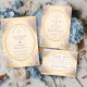 En romantisk vintage bröllopsdesign inspirerad av klassisk europeisk trädgårdspapper. Mjuka akvarell-lavendelblommor ramar in en elegant skållad etikett, placerad mot en varm pergamentbakgrund med ömtåliga botaniska accenter. Den förfinade typografin och det antika inspirerade ramverket skapar en tidlös, värdefull estetik som påminner om landsbröllop i Provence, perfekt för par som älskar eleganta botaniska detaljer och vintage charm.