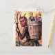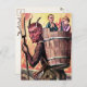 Vintage leende Krampus med barn i tunnan vykort. Högkvalitativ, återställd vintagebild från det tidiga 1900-talet.