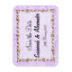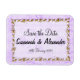 En charmerande magnet för lila bröllop spara datum för kylskåpet (eller för var det än är lämpligt). Den har en charmerande lila mönster av dammvirvlar, med personlig namn och dejt i ett dekorativt, vintage, gyllene ram.