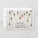 Bröllops RSVP med vintage edison hängande ljus över en väderbiten vit tegelbakgrund.