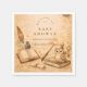 This enchanting baby shower design features a magical vintage storybook scene filled with charming wizard-inspired details. Delicate illustrations of potion bottles, spell books, antique keys, candles, and a wise little owl surround an ornate decorative frame, creating a whimsical atmosphere perfect for a magical celebration. The warm parchment background and soft watercolor textures give the design a nostalgic fairy-tale aesthetic inspired by classic fantasy illustrations. Ideal for wizard-themed baby showers, magical woodland celebrations, or whimsical fantasy gatherings welcoming a little wizard on the way.