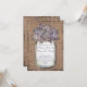 Vintage Mason Burk med blomsterBouquet på Rustic Burlap Skriv ut bröllopsinbjudningar. Den här plågsamma antika designen har ett utslitat utseende med en vintage som serverar burk fylld med blommor. På baksidan finns samma mynning i burk på brännvinssymbolen med orden "Kärlek" vid en diagonal. Skrivningen är en lilac lavender lila färg, men kan ändras till vilken annan färg som helst med knappen Anpassa den.