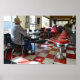 Till lämnat väntar en man på lunch i Valentine middag i Wichita, Kansas, medan vanliga patroner i bakrummet pratar om måltider. En annan man läser en tidning i ett favoritbås. Den röda och vita golv, de röda vinylstolarna och bålen med aluminiumtrim ökar vintagens känsla och tilltalande. Den här byggnaden i middag är en modifierad dubbla av typen lyuxe Valentine. Dessa restauranger tillverkades i Wichita från slutet av 1930-talet till mitten av 1970-talet. Försäljningen av byggnad expanderade över hela landet, och snart var alla Valentindiner över hela Stater. Många är fortfarande i använda i dag.