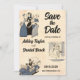 Den här vintagens efterhandsbaserade bröllopsinbjudan med tecknad passar för ett modernt bröllop. Den gamla minimalistiska designen har Vintage Modern Retro Bröllop spara datum-inbjudan